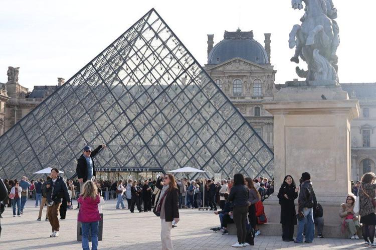 10月22日,在法国巴黎,大量游客聚集在卢浮宫博物馆的玻璃金字塔入口前。新华社记者张百慧摄